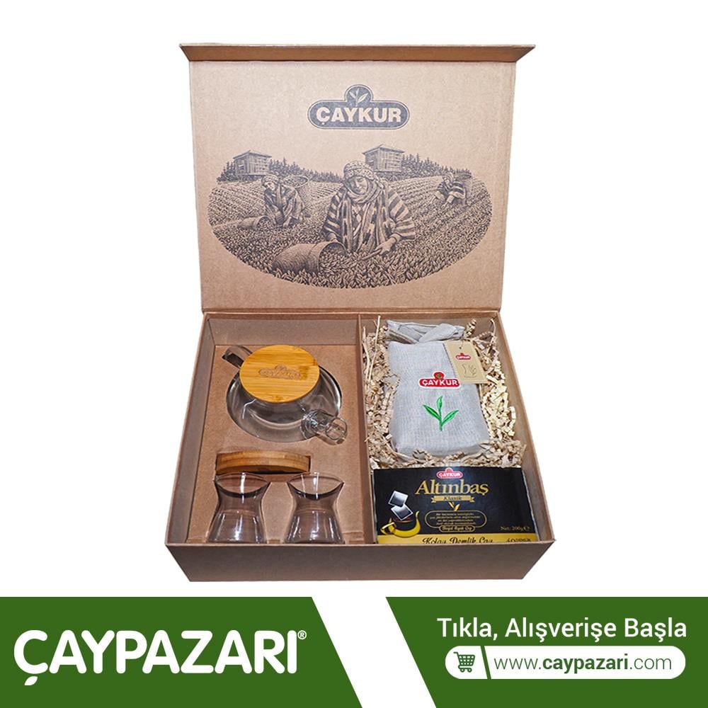 1 paket Doğu Karadenizde Rize Bezi veya Feretiko olarak bilinen ve doğal kenevir bitkisi ipi ile dokunan bez torbanın içersinde 1 paket 200 GR Altınbaş dökme çay, 1 adet bor hammaddesi ile üretilen ve ateşe dayanıklı cam demlik, 2 adet özel kesim ince belli cam bardak ile iki adet ahşap tabak bulunuyor.